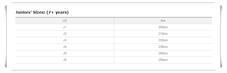 아이의 연령에 맞는 사이즈표를 확인하셔서 구매에 착오가 없도록 해주시면 좋을듯하구요, 미국 Juniors 사이즈를 보시면 한국 일반 여성 사이즈와 비슷하여 디자인이나 색상이 이쁜 신발이있을 경우 Juniors 신발을 구매하는것도 좋을것 같아요.
